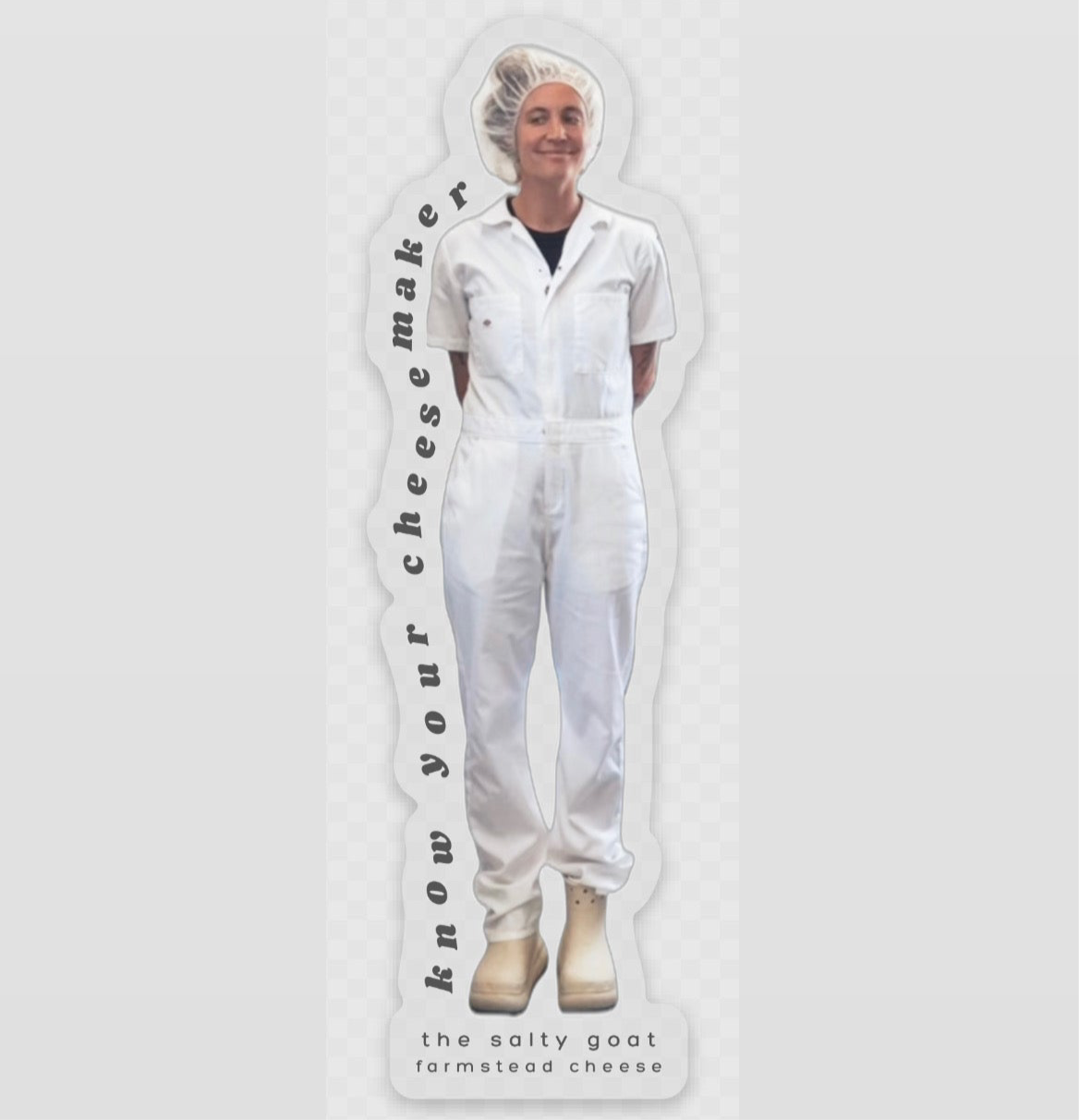 This sticker features Erin, the founder, goat farmer and cheesemaker behind every batch at The Salty Goat, dressed in full creamery whites. It’s a small reminder of something we care deeply about: knowing the people who make your food. We believe there’s value in knowing your cheesemaker, and farmers - how they work, what they stand for, and the care we put into your food.